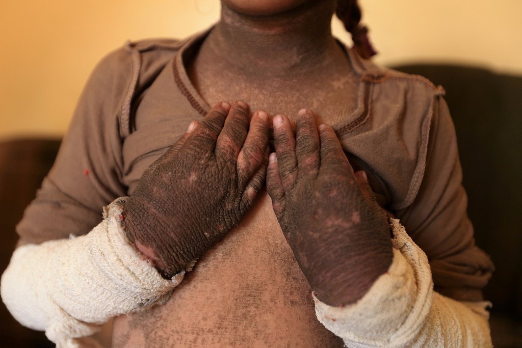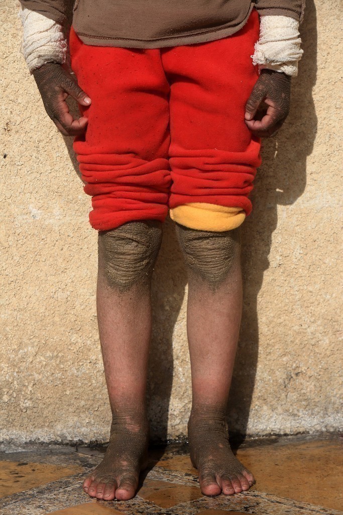 图为爆炸发生一个月后,5岁女孩Doaa的皮肤依然硬化发黑。