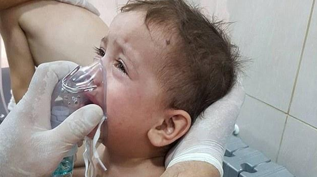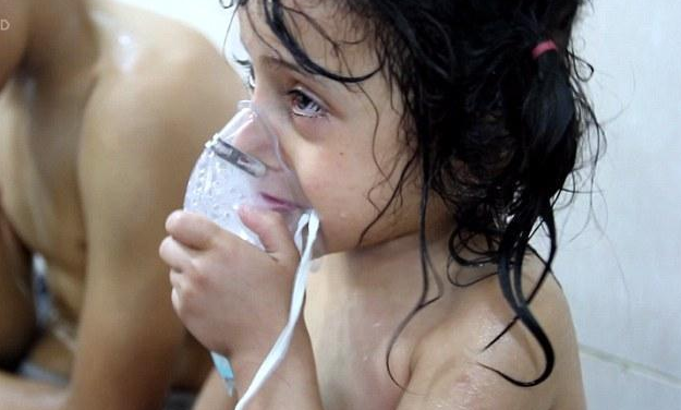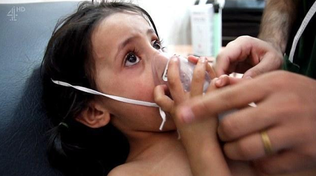 其中包括37名儿童,他们戴着面罩表情痛苦,图为呼吸困难的儿童。