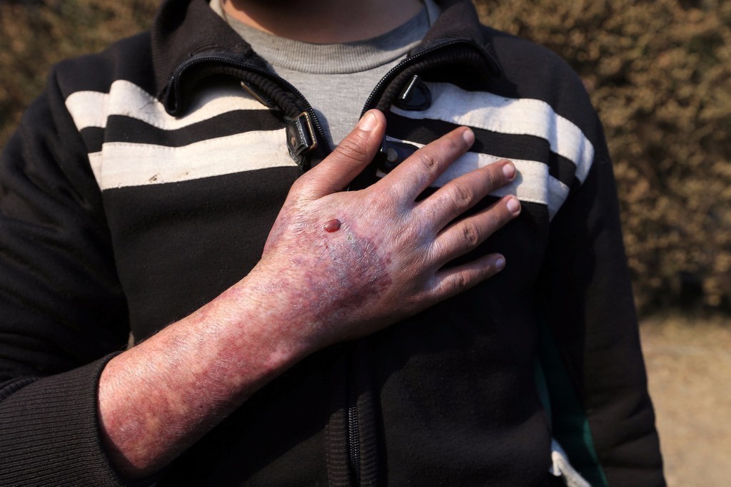 另一位受害人Awwad是在帮助搬走炮弹的时候被感染,他说,“那天晚上我去睡觉,几小时后我的胳膊变红了。第二天,我开始起水疱。”