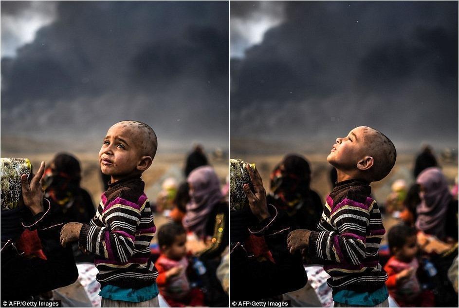 据统计,联合国难民署计划收容15万由伊斯兰国家城市冲突而产生的难民。图为一名在逃难的孩子抬起头,仰望浓烟滚滚的天空,他和母亲已经离开了他们的家园,但未来在哪里尚不可知。