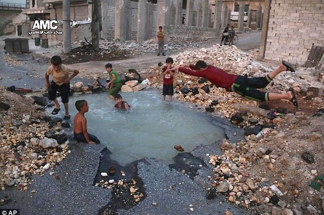 战乱中,几个叙利亚小男孩正在“泳池”中游泳,他们的泳池是被炸弹炸开的大坑,周围还堆着建筑损坏留下的碎石。