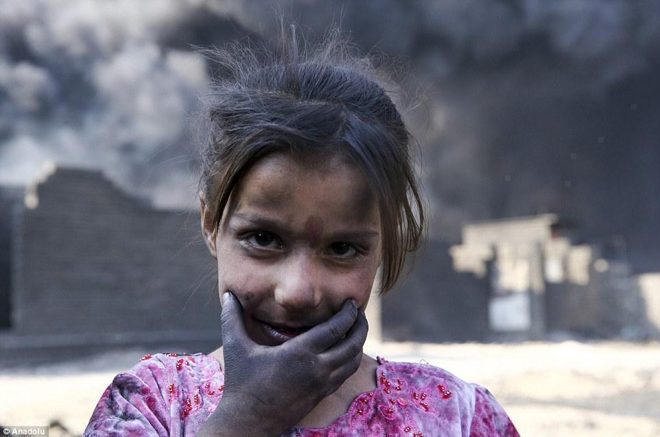 照片中的女孩用双手捂着脸颊,她和弟弟从战争的枪口存活了下来,但却不得不生活在有致癌危险的黑烟下。