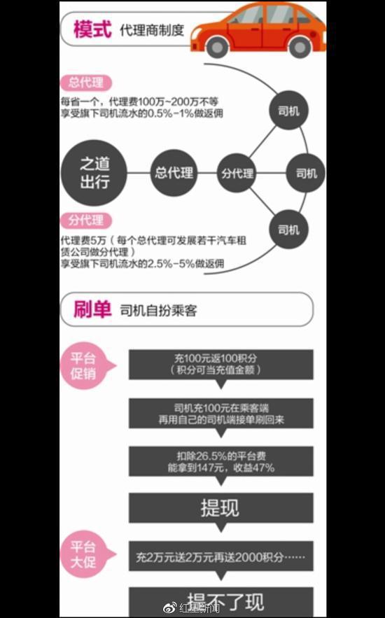 "之道出行"在全国推行代理商制度,每省一个总代理,每个总代可发展若干汽车租赁公司做分代理。总代理费100万~200万不等,分代理则一般为5万。总代理享受代理范围内所有司机流水的0.5%-1%做返佣;分代理则享受旗下司机流水的2.5%-5%做返佣。