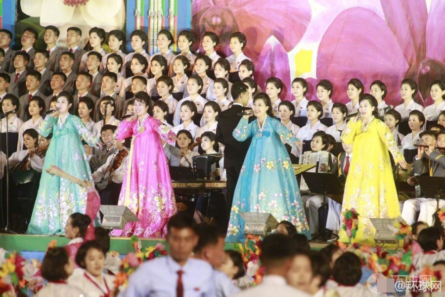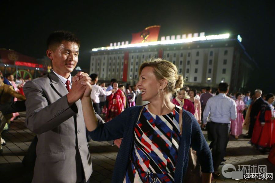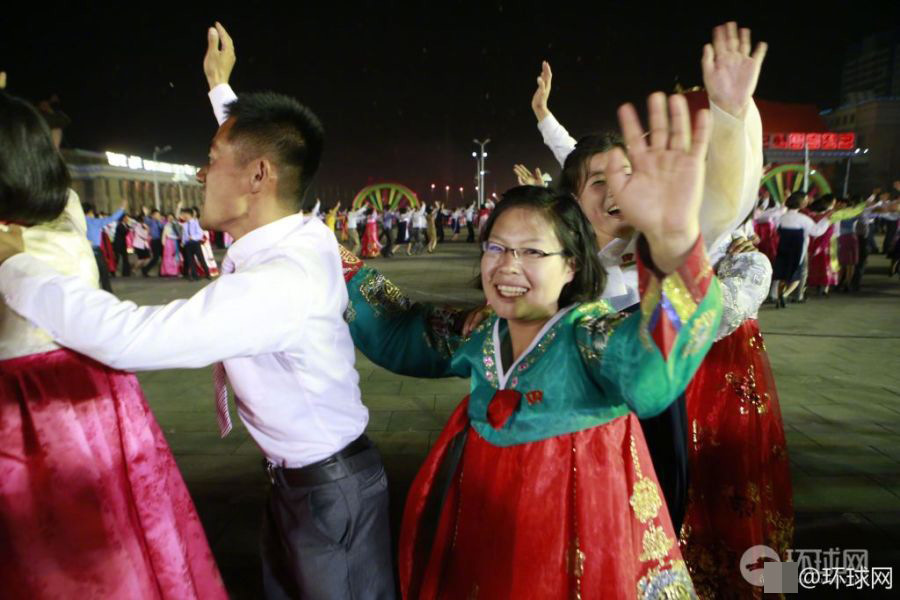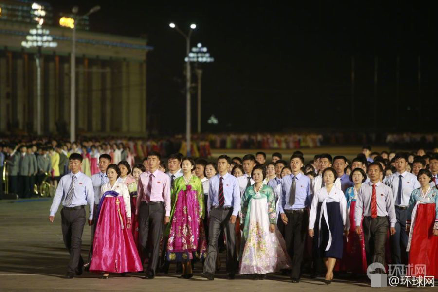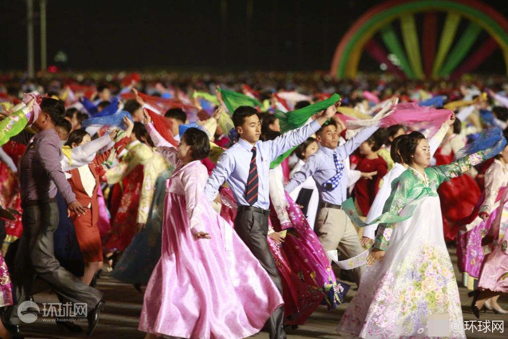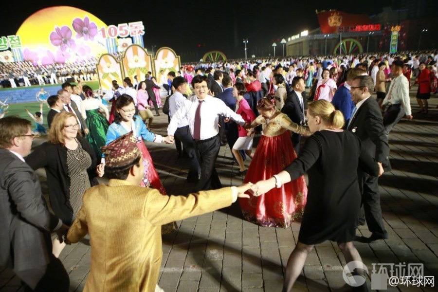 2017年4月15日晚,朝鲜平壤在金日成广场举行青年舞会,广场上聚集着上万大学生跳集体舞。专业演员在舞台中央表演合唱杂技等节目,还邀请观看的国际友人共舞。舞会最后燃放了烟花。