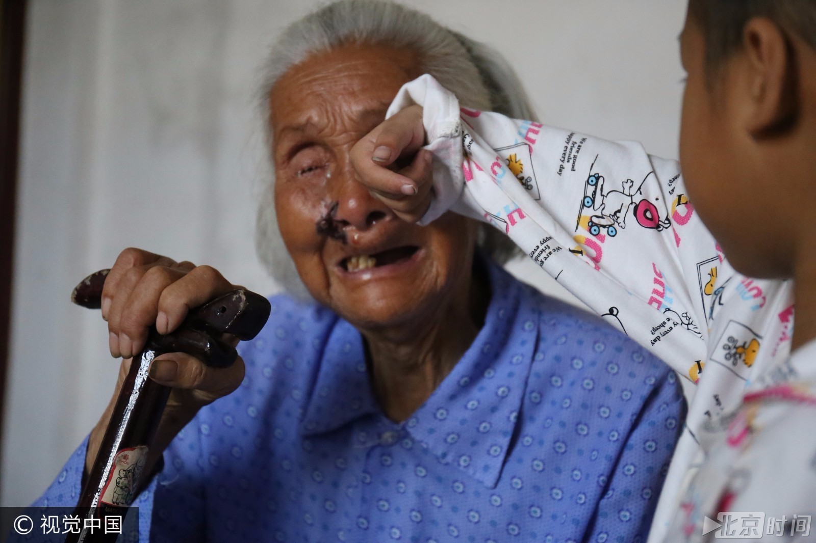 第三站来到了离家不远的姥姥家。姥姥是最亲的人,是她一手把贝贝带大的。自从贝贝住院后,怕刺激到年迈的她就没敢告诉。也是从住院起祖孙二人就再也没有见过,姥姥一看到贝贝就失声痛哭,懂事的贝贝给姥姥擦着泪。