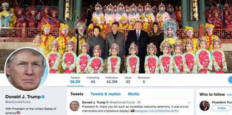 相较而言,特朗普的发言显得更加随性。他难掩对习主席本人和对中国的喜爱。在抵华第一天,就将自己的推特封面换成了与习近平夫妇以及京剧演员们的合照;并在到访之前,连发多条推特表示期待这次会晤;今天的发言中,他还透露,昨天在故宫原定25分钟的晚宴被延长到至少2个小时,因为聊得实在太愉悦,“我珍惜在这里的每一分钟”。