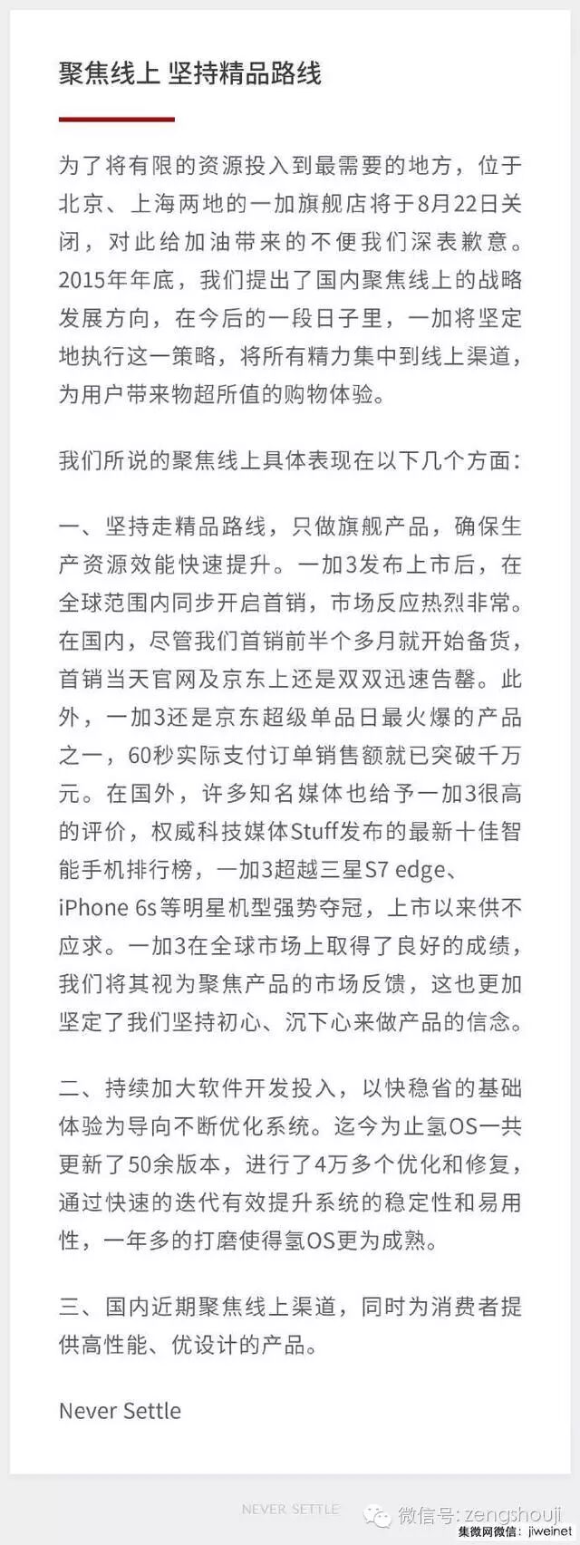 就在今天,一加科技官方微博宣布,关于一加国内旗舰店业务调整的通知。
