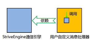 再举一个编程中的依赖倒置的例子。我们知道,在通信中,消息的收发和消息的处理往往密不可分。就一般的通信框架而言,消息的收发通常是已经实现了的,而消息的处理则是需要用户来自定义完成的。先看一个正向依赖的例子:轻量级通信引擎StriveEngine。tcpServerEngine是StriveEngine.dll提供通信引擎,它发布有一个MessageReceived事件。假设我定义了一个CustomizeHandler类来用于消息处理,那么CustomizeHandler的内部需要预定tcpServerEngine的MessageReceived事件,因此customizeHandler依赖于tcpServerEngine,这就是一个普通的依赖关系,也就是高层模块依赖于低层模块。