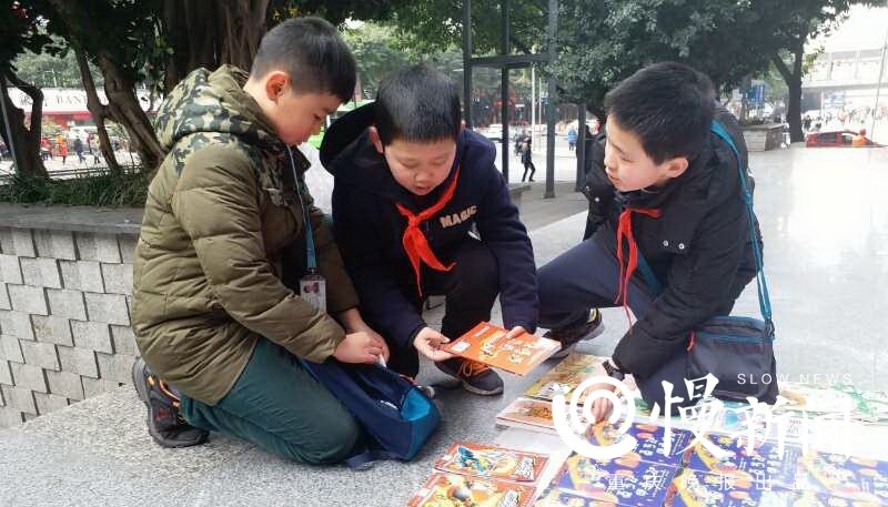 近日,市民陈先生在重庆南坪工贸附近拍下一组画面:5个10岁左右的小男孩,在街头摆着一个书摊,在寒风中,依然笑脸洋溢的吆喝卖图书。