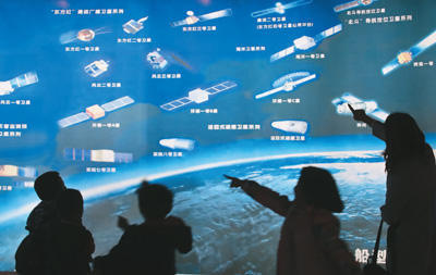 四月二十二日,参观者在位于山东烟台的中国航天五一三研究所观看“卫星飞船型谱图”。唐 克摄(人民视觉)