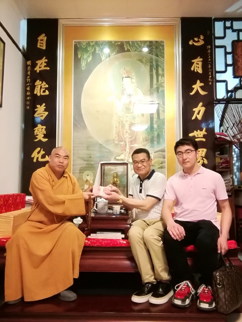 团友梁志旺(下图右二)深感六祖惠能思想文化教育了自己,教育了后代,特携儿子(右一)当场向国恩寺捐助了一笔现金善款。他表示一来家人行善积德,二来为禅宗文化建设作点贡献。