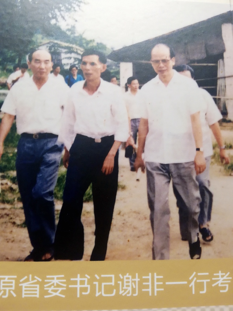 下图:1991年7月,时任新兴县县委书记司徒绍同志(前排左一)陪同时任广东省省委书记谢非同志(前排右一),视察当年的温氏。温氏集团创始人、先董事长温北英先生(前排右二)作现场介绍和汇报。