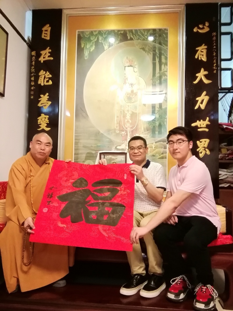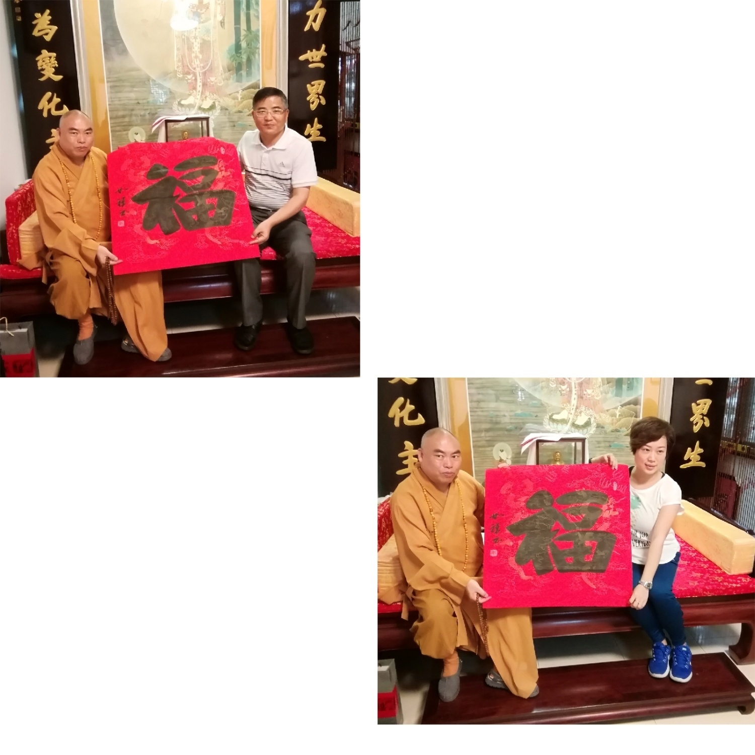 释如禅方丈对梁志旺父子、谭坚艺及其他团友的捐助善举一并致谢,并向他们回馈赠送亲手写“福”字书法墨宝。由于本图文篇幅有限,不能一一展示,谨以此文致敬各位善长仁爱者。