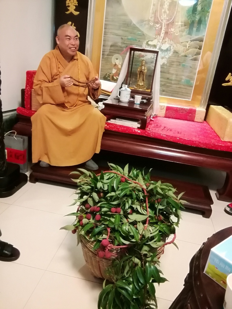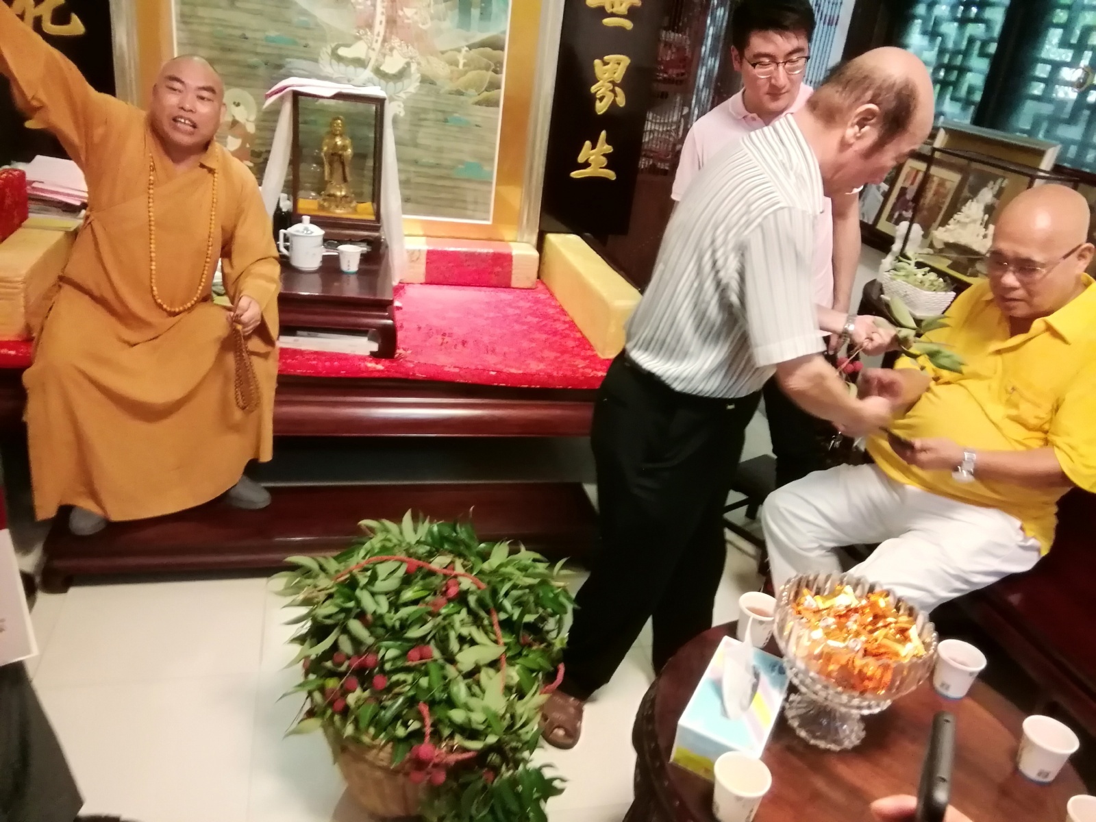 聆听释如禅方丈话禅开示,互动交流。值一年一度新兴佛荔节,释如禅大和尚向每位团友赠送刚从六祖手植千年佛荔(属新兴香荔)采摘下来的佛荔枝。众团友品佛荔感佛恩,纷表致谢。