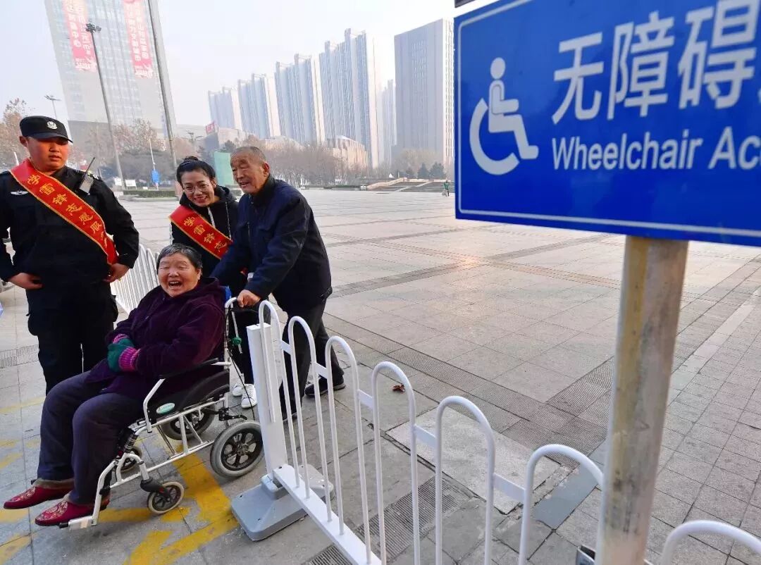2017年12月2日,河北唐山市志愿服务组织孵化基地(社会公益志愿服务之家)正式成立。这是当天两名学雷锋志愿服务者准备帮助老人从无障碍通道通过。新华社记者 杨世尧 摄