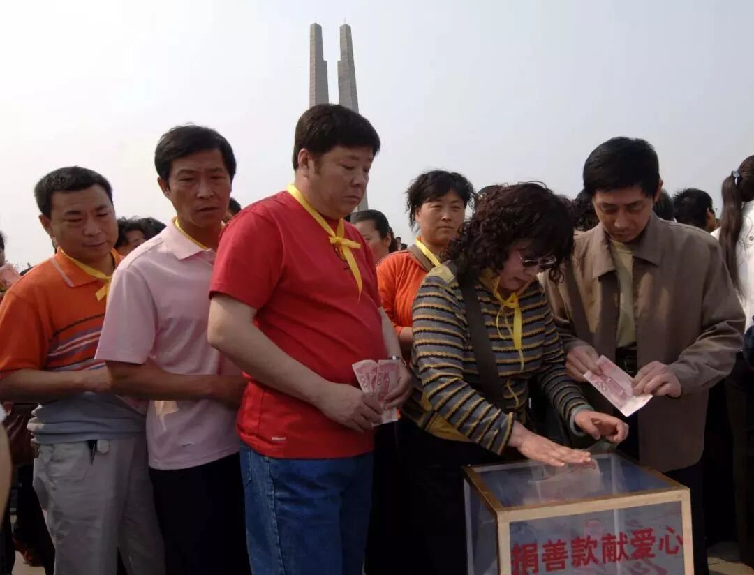 2008年5月20日,在唐山抗震纪念碑广场,从河北省各地赶来的唐山“地震孤儿”们为四川汶川地震捐款。新华社记者 巩志宏 摄