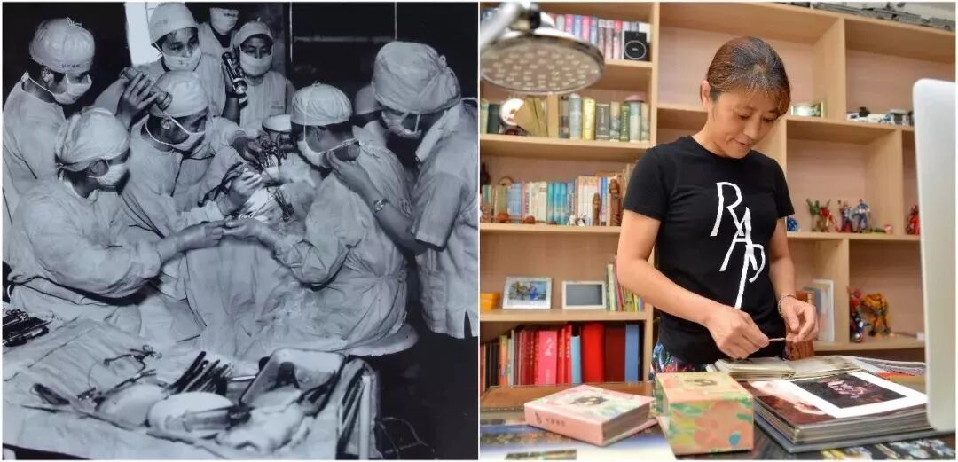 拼版照片:左图为唐山大地震发生后,上海医疗队在给伤员做手术(资料照片);右图为2016年7月24日,“地震婴儿”孙沪在家中整理老照片(新华社记者 牟宇 摄)。