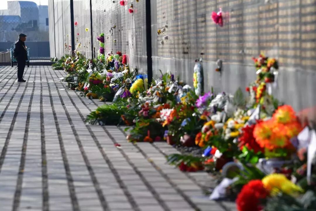 2018年4月4日,一名市民在唐山地震纪念墙前悼念逝者。新华社发(董钧 摄)
