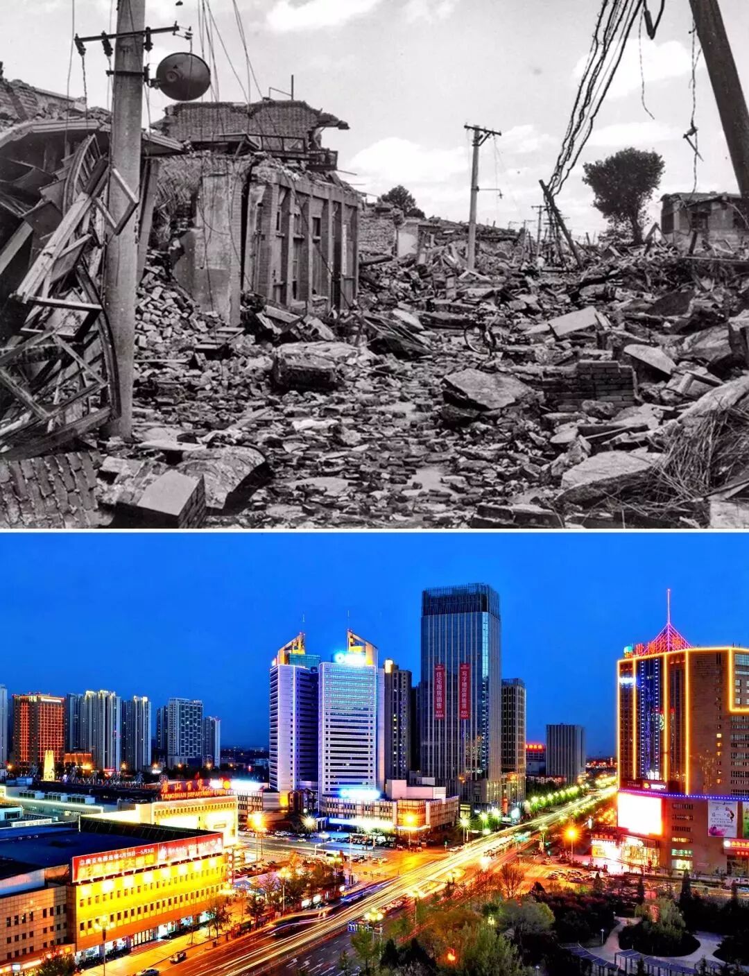 拼版照片:上图为唐山市震后照片(资料照片)。下图为2016年5月17日拍摄的唐山市夜景(新华社记者 杨世尧 摄)。