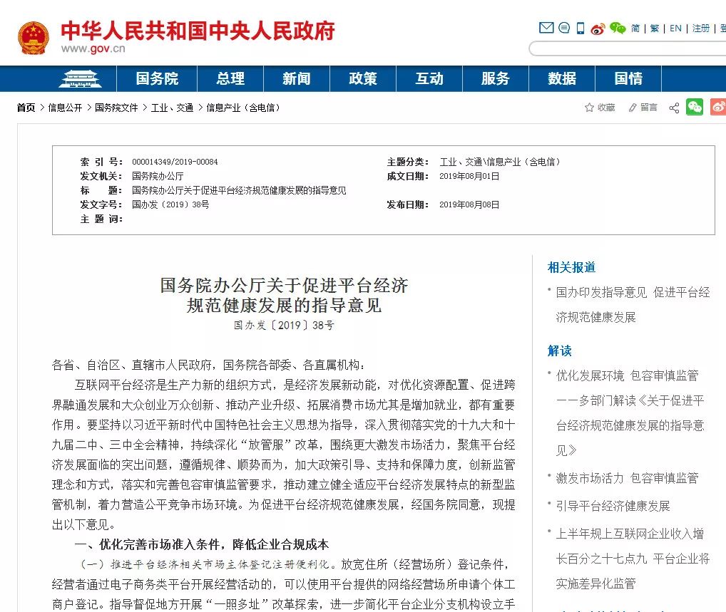 国务院办公厅关于促进平台经济规范健康发展的指导意见
