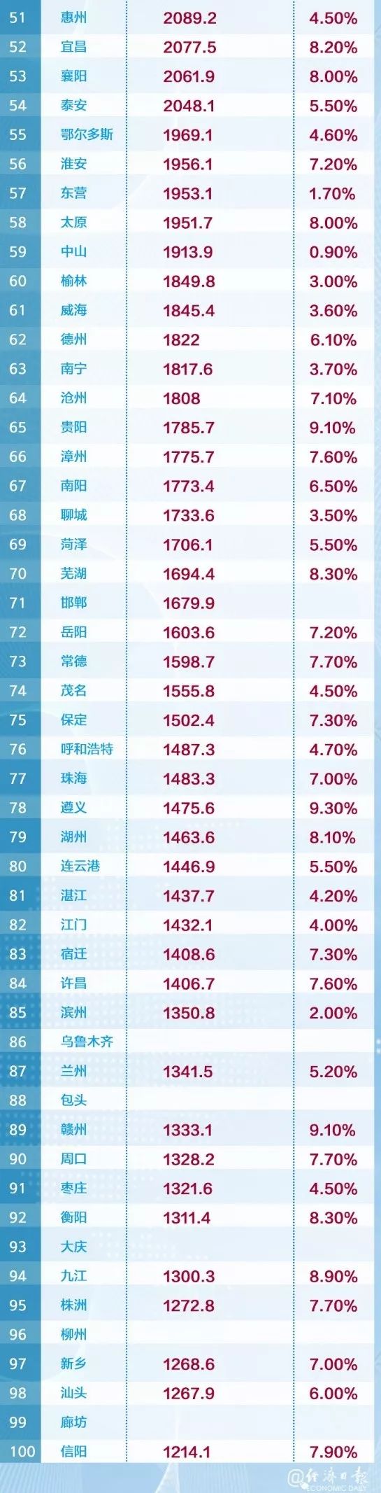 。去年排名100位的焦作市GDP总量为1125亿元,而今年第100名的信阳市已经达到1214亿元。