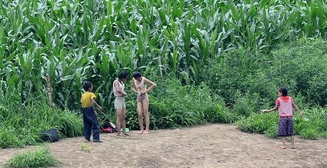吉林省鸭绿江的对岸便是朝鲜。虽说朝鲜是个封闭的国家,然而,通过鸭绿江,我们也能窥探一番朝鲜人民的生活状况。图为姑娘在玉米地里摘玉米,卷起衣服装玉米粒。