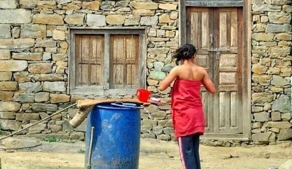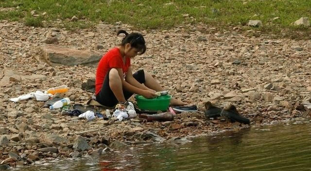 图中的朝鲜姑娘正在露天洗澡