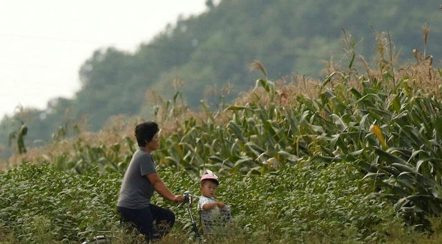 图中为朝鲜女人骑着自行车,带着孩子到田野里