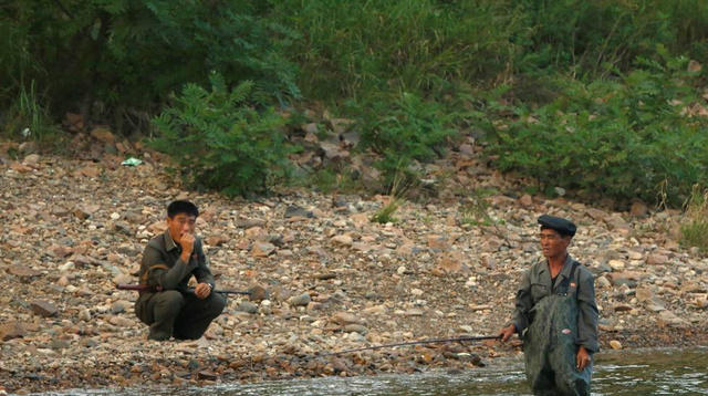 图为朝鲜男人在河边垂钓
