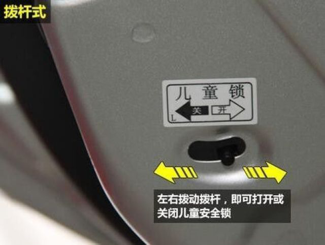 汽车儿童锁又称车门锁儿童保险,设置在汽车的后门锁上,打开后车门在门锁的下方有一小拔杆,拨向有儿童图标的那端,再关上车门,此时车门在车内就无法打开,而只能在车外打开。