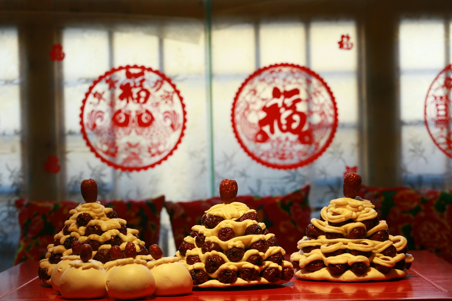 枣花糕形状繁多,以面作圆底盘,卷条边缘为纹,铺一层红枣,上面再加上一层比第一层略小的带花边的面盘,上面可做上各种不同寓意的吉祥饰物,为生活中找到自己美好的愿望和精神寄托。 如今年味过的越来越淡,而且随着父母远离家乡之后,家乡的这些年俗,以及过去的年味,却似黑白老电影一样,仍会在我的眼前一幕幕闪现,时时刻刻让我对它魂牵梦绕,定格在心间。