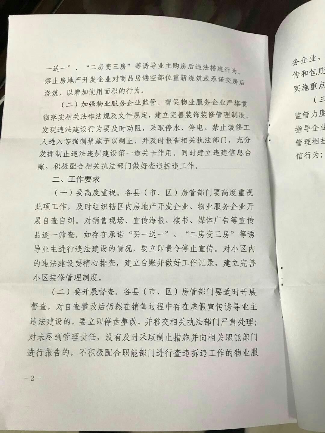 1、禁止房地产开发企业在销售过程中将“赠送面积”作为销售卖点,违规承诺“买一送一”、“二房变三房”等诱导业主购房后违法搭建行为。