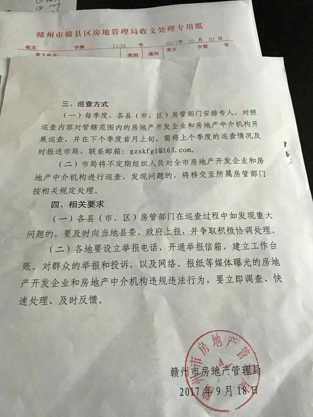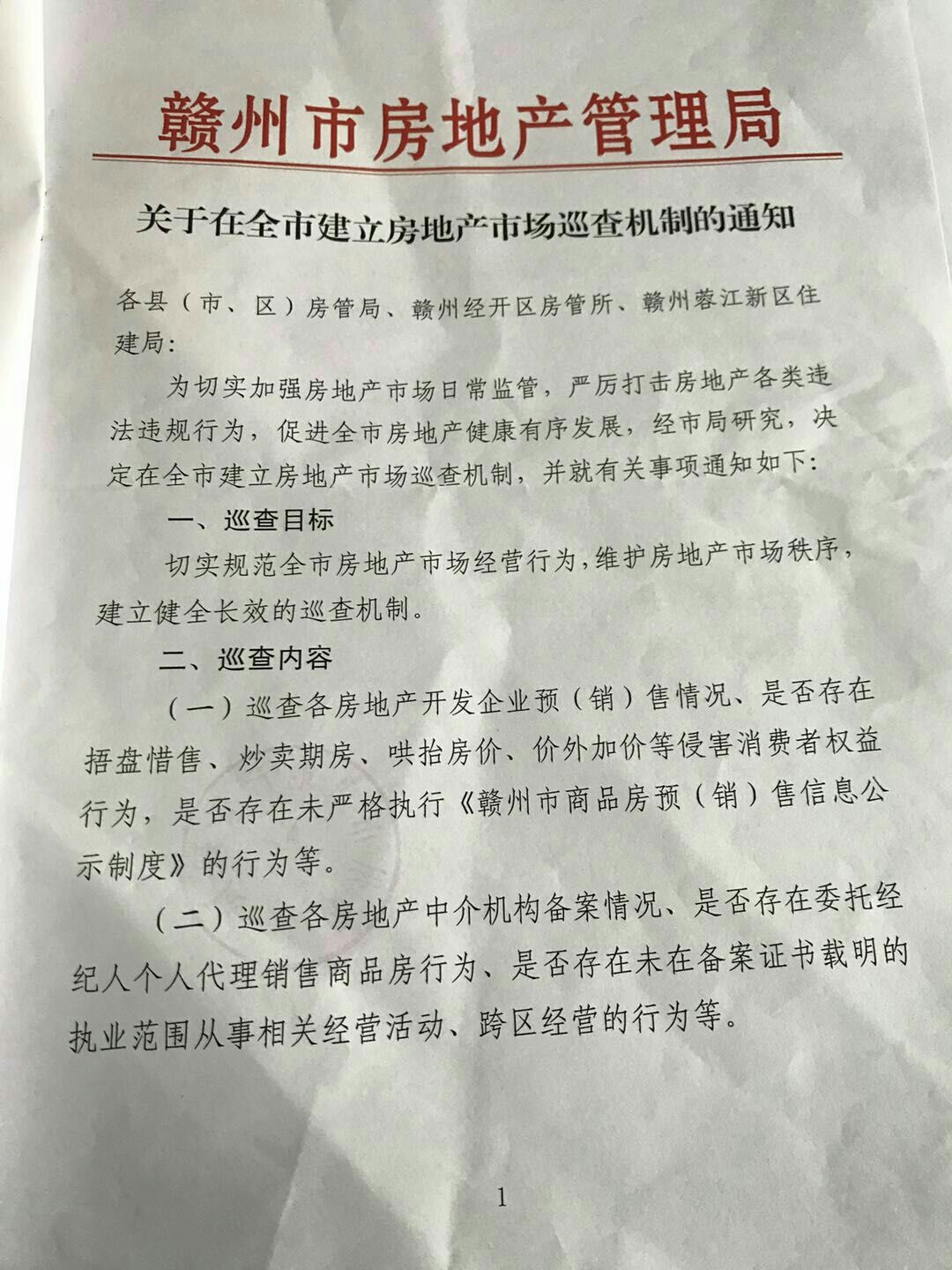根据赣州市房管局文件的规定,要求各区、县房管局履行好工作职责,巡查房地产开发企业,切实规范房地产市场经营行为,维护房地产市场秩序,建立健全长效的房地产市场巡查机制。