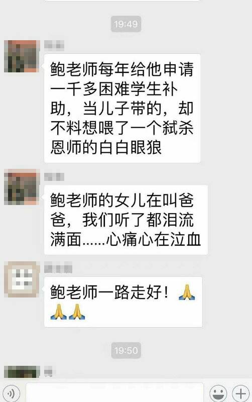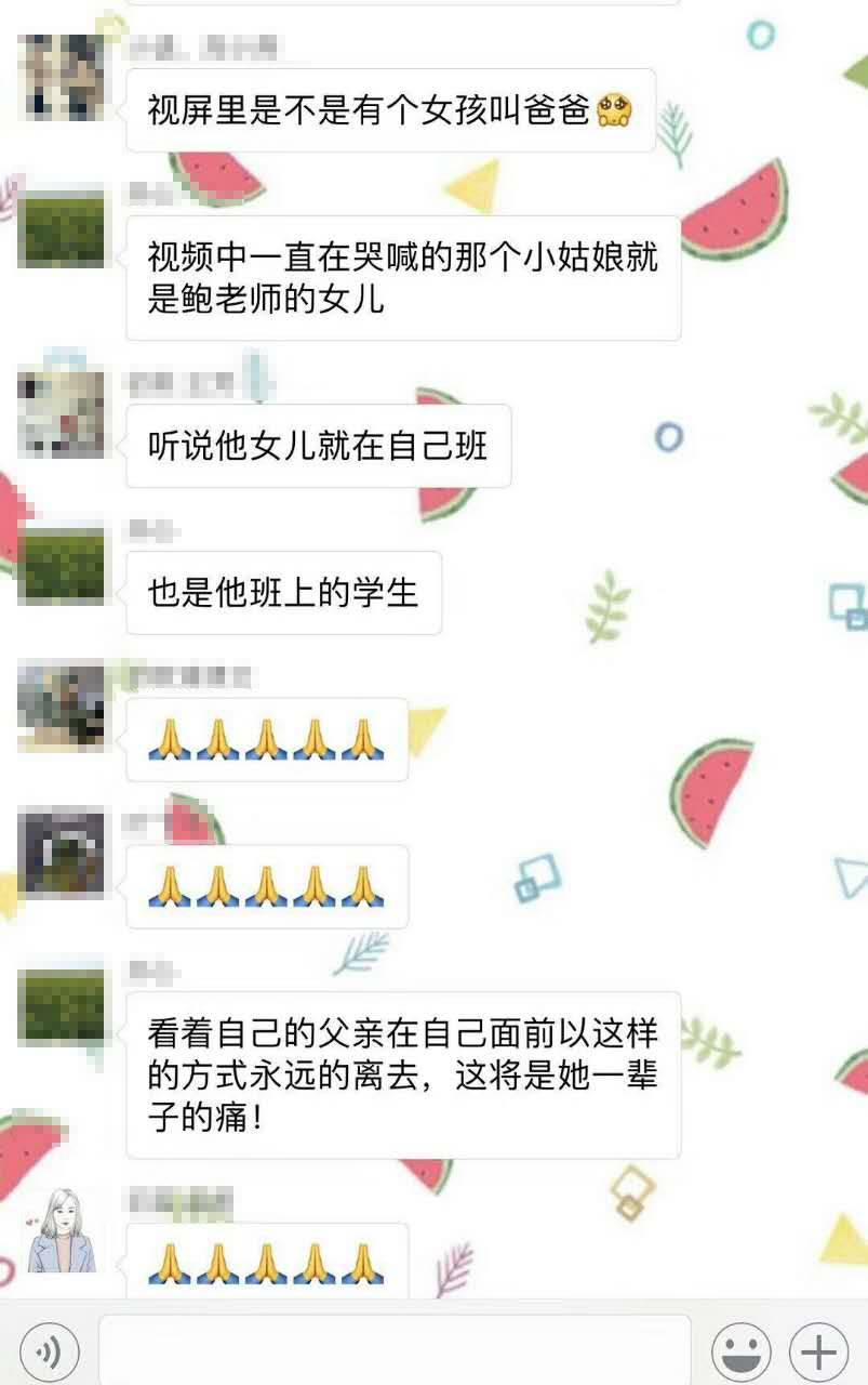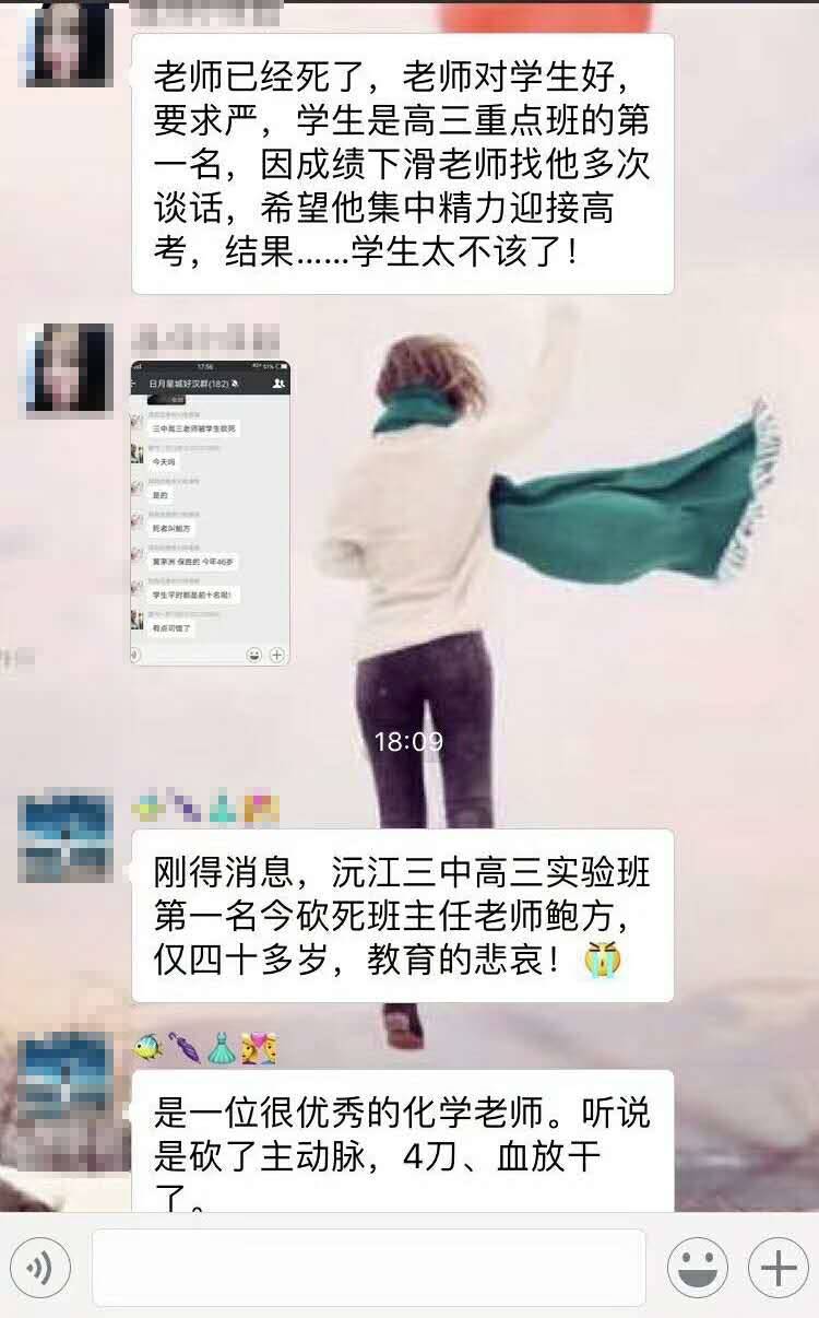 根据下面网友聊天截图可知:这老师是在自己十五六岁的女儿面前,当着女儿的面被凶手杀害!且是血放干了而死!凶手曾是高三重点班第一名的学生,后来成绩下滑!