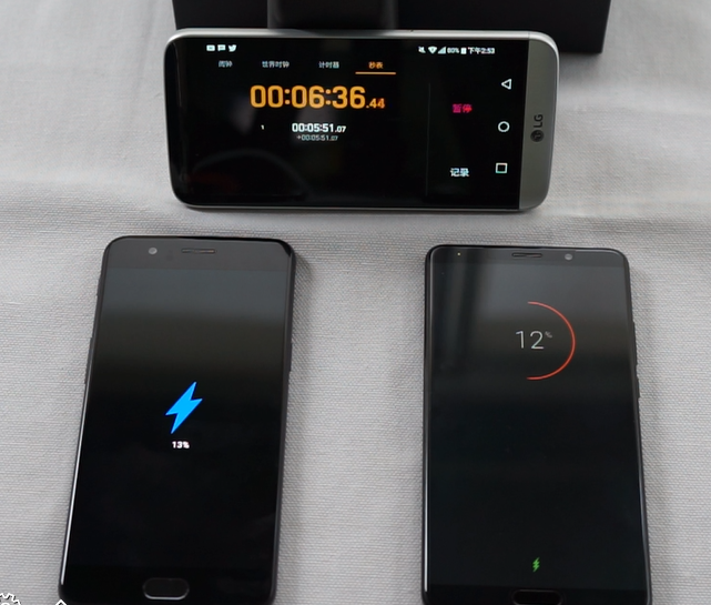 为了让这两款手机的充电速度能够发挥到极致,我们将一加5和华为Mate 10的电量全都耗光,让这两款手机在关机的情况下进行充电对比。不够这里要说明的是,一加5的电池容量为3300毫安时,最高充电功率是20W;华为Mate 10电池容量是4000毫安时,最高充电功率是22.5W。