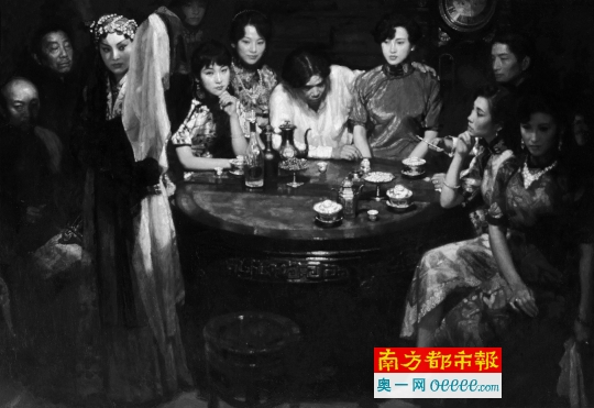 《玉堂春暖》完成于1993年,高169 .5厘米,宽243.5厘米。该画延续陈逸飞典型的古典写实风格,在橘黄为主的暖色调中营造出民国时期老上海纸醉金迷的流金岁月。