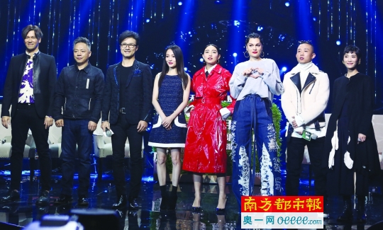 左起:李圣杰、李晓东、汪峰、张韶涵、张天、Jessie J等7位歌手和踢馆歌手苏诗丁亮相发布会。