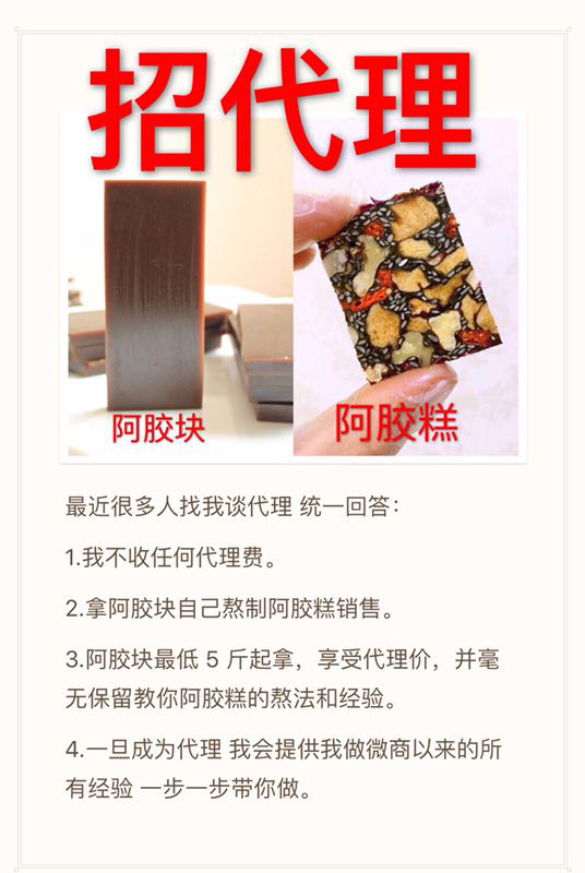 招代理,统一回答。如果只追求收入而不在乎品质不要找我。一上来就让我给你保证月入几万的更别找我我是靠手艺吃饭的老实本分人没那么多虚的。让我去代理你们量产阿胶糕的更更别找我,我只想找志同道合,踏实并认可阿胶能坚持做下去的人,至于月入多少就看你多努力,永远没有不劳而获的东西。