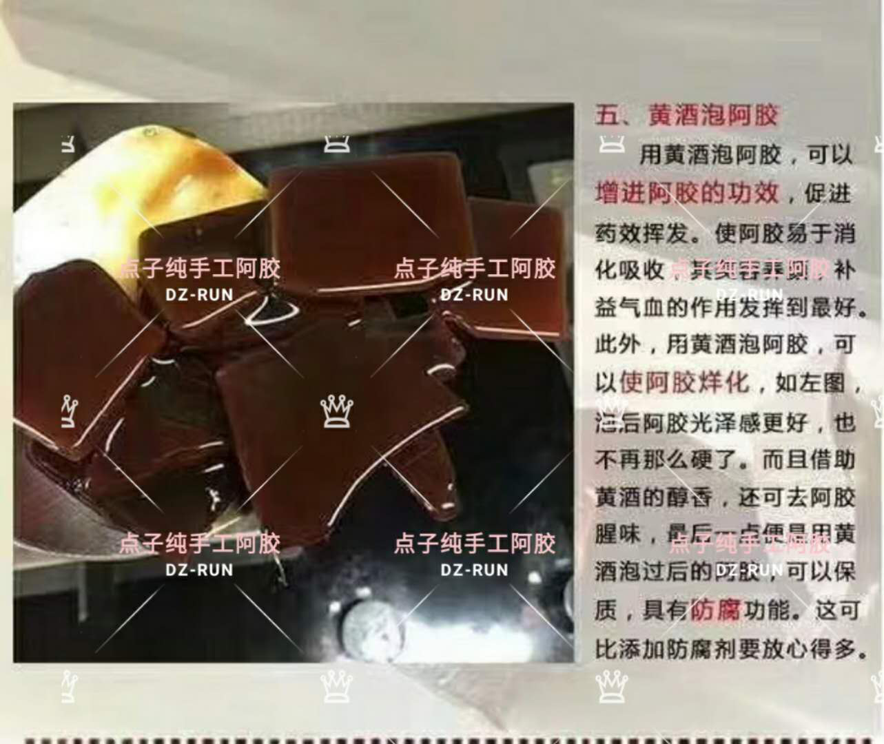 阿胶必须要搭配黄酒一起才能将阿胶的药用价值发挥到最好。通常自己买阿胶让药房加工的,药房都是将阿胶打成粉,打成粉的阿胶胶原蛋白很难分解出来,且不易被人体吸收。 纯手工制作阿胶糕,是阿胶用黄酒经过24小时的浸泡,这样胶原蛋白才能发挥到极致,丰富的胶原蛋白成为了天然的粘稠剂,更有助于人体的吸收。不像某些批量生产的需要添加粘稠剂才能增加阿胶糕的粘性。这就是为什么,有些朋友第一次吃时会无法接受黄酒的味道,但多吃几块后又会爱上它。