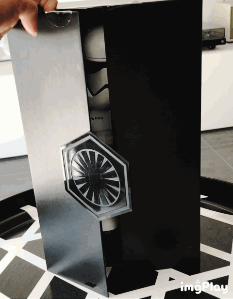 “纪念照”拍好,老公就迫不及待的开机试试,白兵机器人的开关在他背后的腰部的桶装背包上,按一下他会开始自检,摇头晃脑的,左右手也会摆动,用左右两只脚单脚迈步,并且很电影腔的报上自己的编号。开始玩之前要在手机上安装APP,在应用市场上搜索stormtrooper就能搜索到FIRST ORDER SROEMTROOPER ROBOT APP这款APP,大概要2G的空间,点进去后需要注册和登陆,连接设备,之后可以开始训练我的小白兵啦。