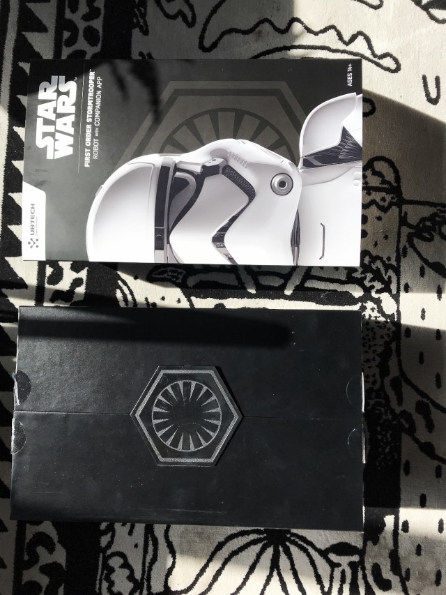 黑底色和白兵机器人的大头写真照(下巴左边的美人痣原本以为是摄像头,其实摄像头很巧妙的藏在了眉心处)衬托的就是我大第一秩序军团的肃穆感,哈哈哈!翻开反面就是玩具本体的全身像和功能介绍,还是比较清楚的,但是都是英文,右上角一个小小的迪士尼授权的标志和下部边缘的镭射防伪标志跟产品编码(产品编码是一排钢印的阿拉伯数字,对应的编号应该都是唯一的哦),原本打算是为了搪塞老公而给宝宝来玩的,发现包装上标注14岁限定,看来只能大人来操作来逗宝宝开心了。