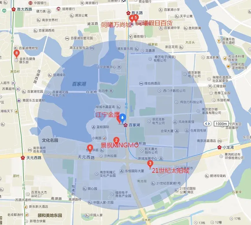江宁区百家湖商圈位于江宁中心区域,地理位置优越,经过这些年的发展,由江宁金鹰、景枫KINGMO、21世纪太阳城等商场共同打造的80万平米的Shopping Mall,涵盖了200多个社区,覆盖消费人口150万,年商业购买力可达80亿元。