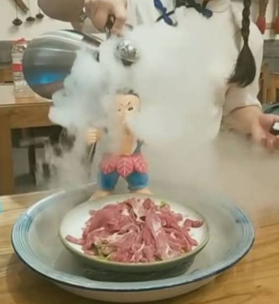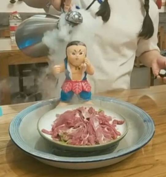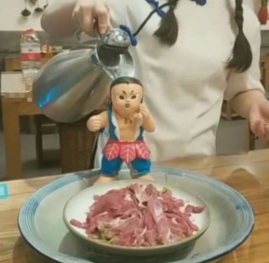 点餐的时候,老板看都没看菜单,就直接爆出菜名,一看就是这里的常客。过了差不多5分钟,服务员把饭菜端上来的时候,集体看傻眼,盛放牛肉的盘子里居然放了一个葫芦娃,这画风怎么有点搞笑呢?
