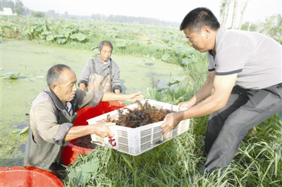 蒙城县立仓镇薛庙村农民将刚捕获的小龙虾搬运上岸。日前,蒙城县立仓镇薛庙村小龙虾养殖基地,农民一大早捕获的4吨多小龙虾被等候已久的外地客商,以每公斤40多元的价格全部收购运往南京、合肥、上海等地市场销售。