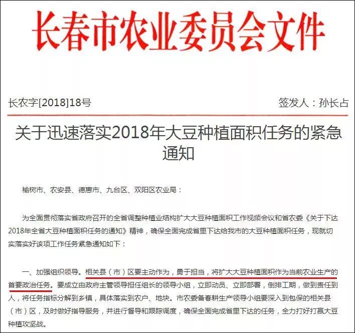 针对这个问题,今年4月底,东北多省密集下发扩大大豆种植面积的文件,并罕见的指出:“将扩大大豆种植面积作为当前农业生产的首要政治任务”。