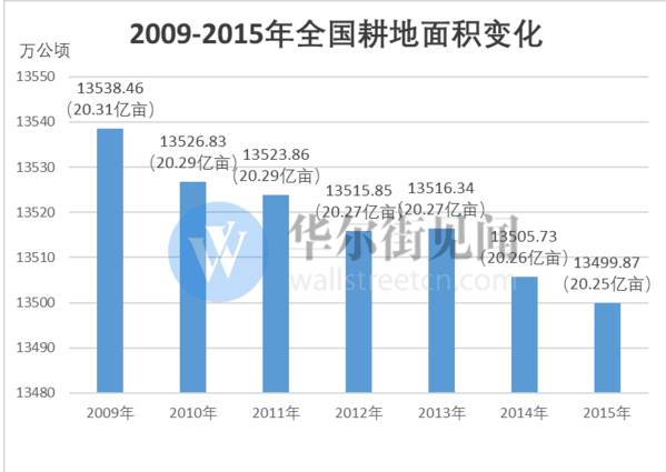 耕地面积少:改革开放后,由于经济建设需要,大量农耕地被用于厂房建设与开发。2009年~2015年六年间,中国耕地从20.31亿亩减少到20.25亿亩,平均每年减少近200万亩耕地。同年,美国耕地面积为23.2亿亩,比中国足足多出3亿亩。