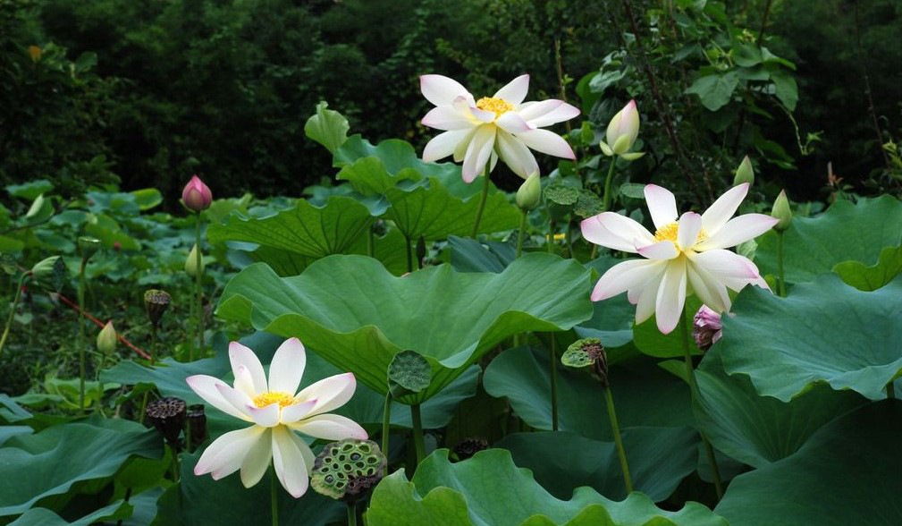 荷叶是错落的,高挑的像伸出的手掌,低矮的蒲伞似的平铺在清水面,用手指按到水里,有些水溢过来,敷在它们的脸上,开始水珠沿着中心滴溜溜地转,一松手,凝聚的大水晶球,向叶子的边沿扩展,一溜儿就跑得无影无踪了。抬头一看,又满是层层叠叠的绿和火炬似的荷花。