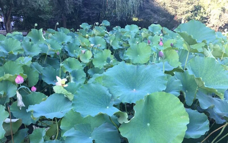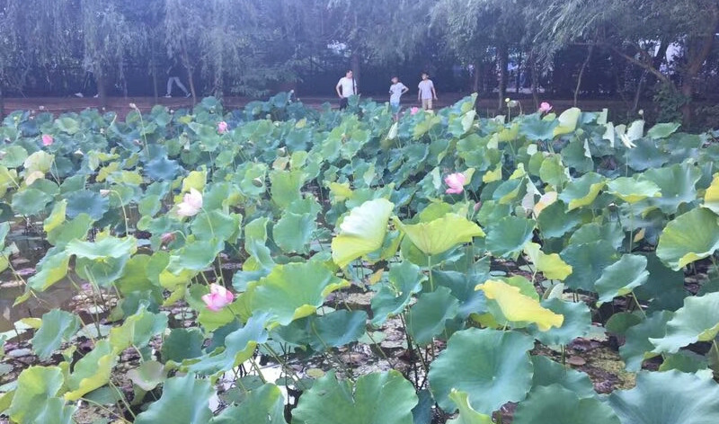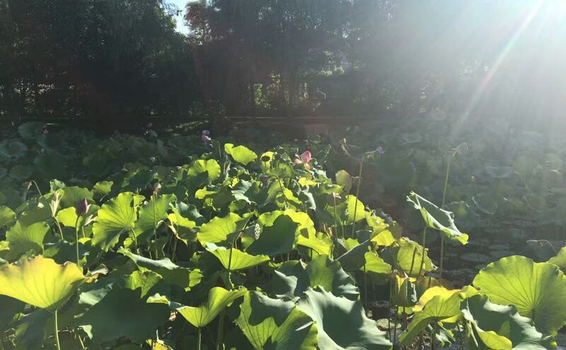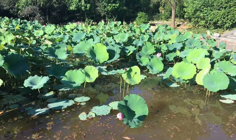 我穿过两排教学楼,左转沿着蓊郁的柳树的方向走去,不一会儿,就到了一口方形池塘,虽然不大,但满是田田荷叶散落着露珠式的荷花,让我像见到久违的挚友一样惊喜不已,嘴里喃喃自语:心若无尘,清风自来。