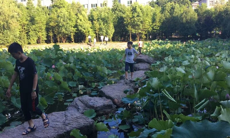 来这赏荷的人不只我一个,放学的学生们早就从不同方向围上来,池塘中间有条高出水面的青石块路,弯弯曲曲的,像一群浮出水面的乌龟来渡“仙人”。