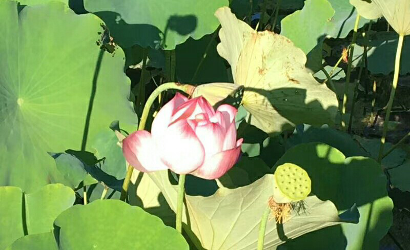 趁夕阳还未沉下去,我摁下快门拍下了荷花和荷叶的交错,拍下了光与影的完美融合,拍下一只蜻蜓站在荷尖上读诗,最后,带着轻歌似的香不舍地挥别心里这块净土。